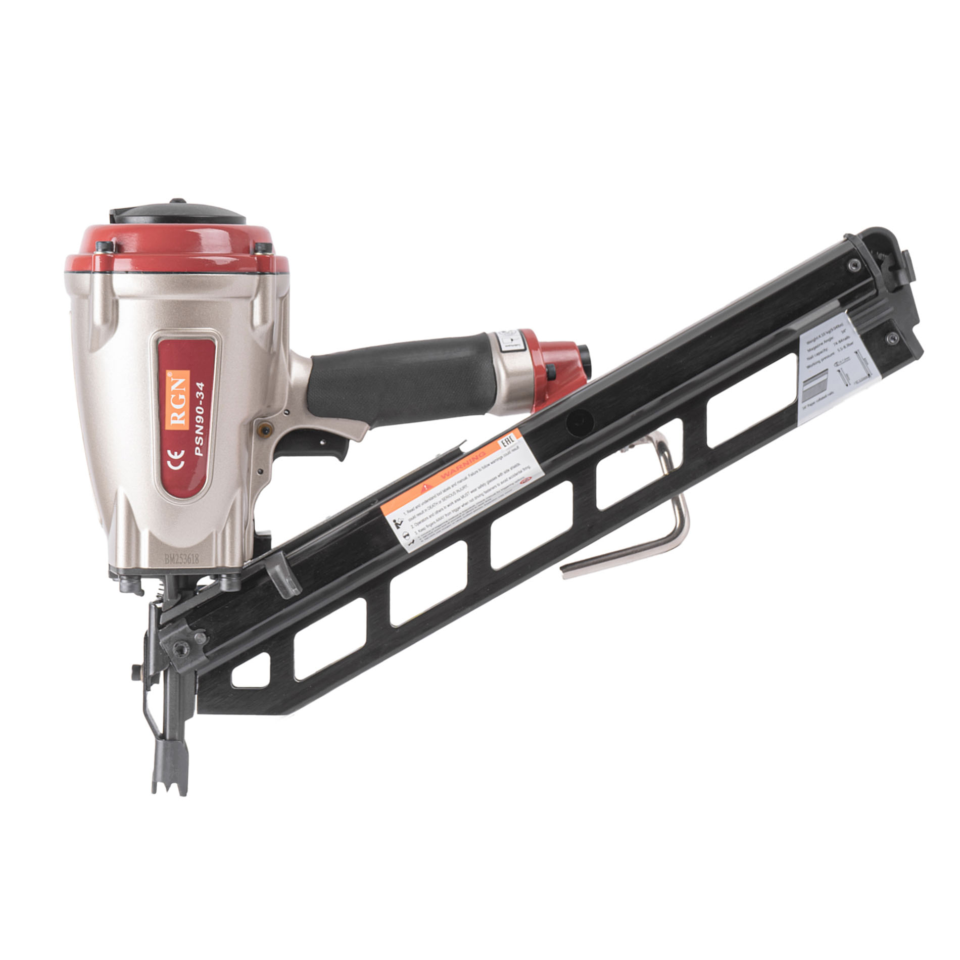 Гвоздезабивной пневматический реечный пистолет RGN PSN9034 для реечных гвоздей в пластиковой обойме с углом наклона 34° и длиной 50-83 мм. Инструмент идеально подойдет для применения в деревянном и каркасном домостроении. Емкость реечного магазина 94 гвоздя, это сравнительно немного и именно поэтому масса снаряженного гвоздями пистолета невелика, что позволяет чрезвычайно удобно оперировать им в труднодоступных местах, в неудобном положении и на вытянутых руках. Инструмент чрезвычайно надежен и прост, его эксплуатация не требует специальных знаний и навыков. Зубчатые зацепы носика предотвращающие его "соскальзывание" с пристреливаемой поверхности, контактный предохранитель исключающий случайный выстрел, регулировка глубины забивания.