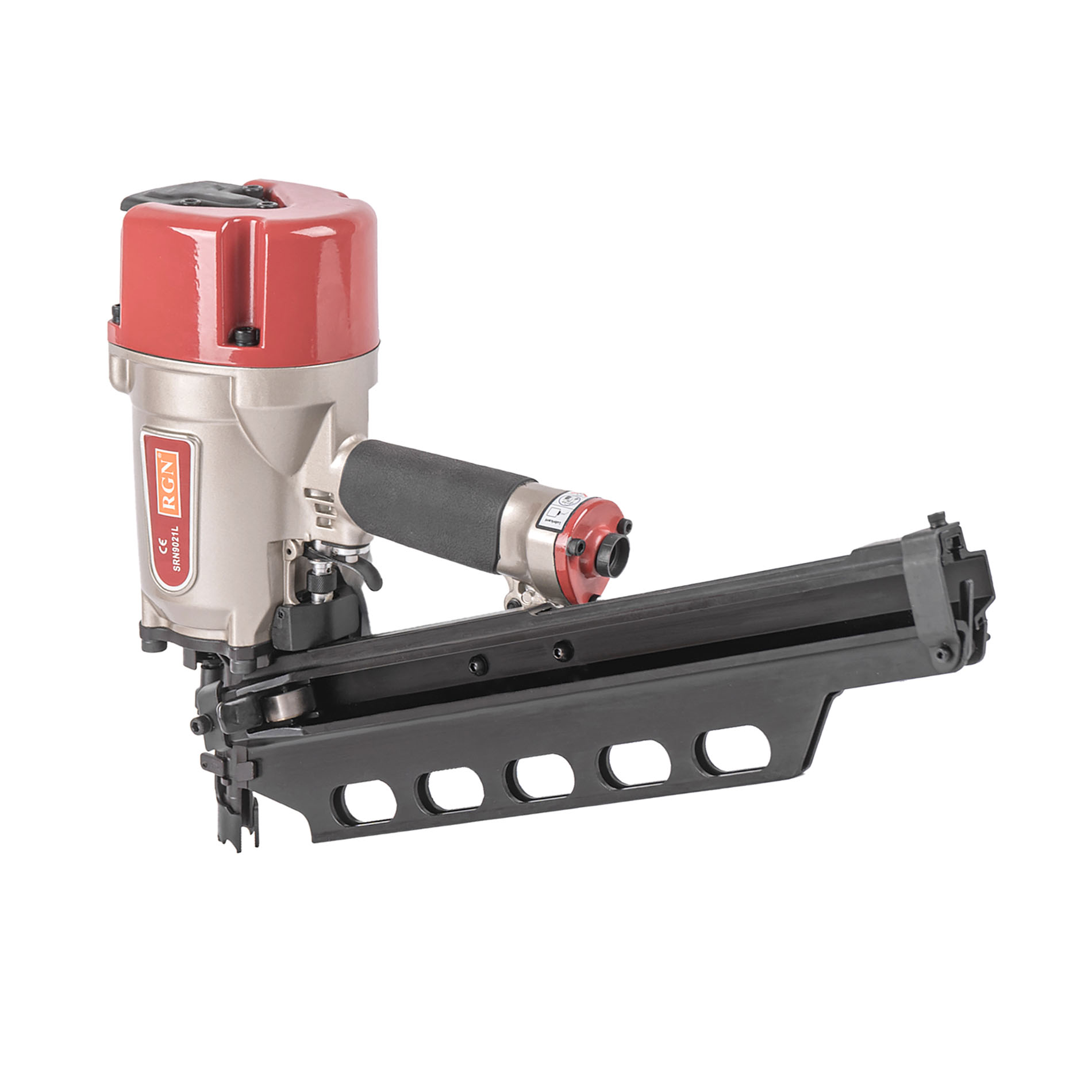 Гвоздезабивной пневматический реечный пистолет RGN SRN9021L для реечных гвоздей в пластиковой обойме с углом наклона 21° и длиной 50-83 мм. Инструмент идеально подойдет для применения в деревянном и каркасном домостроении. Емкость реечного магазина 70 гвоздей, это сравнительно немного и именно поэтому масса снаряженного гвоздями пистолета невелика, что позволяет чрезвычайно удобно оперировать им в труднодоступных местах, в неудобном положении и на вытянутых руках. Инструмент чрезвычайно надежен и прост, его эксплуатация не требует специальных знаний и навыков. Зубчатые зацепы носика предотвращающие его "соскальзывание" с пристреливаемой поверхности, контактный предохранитель исключающий случайный выстрел, регулировка глубины забивания.