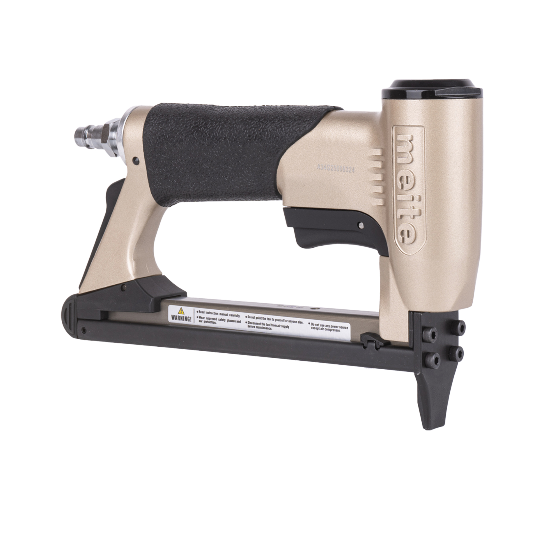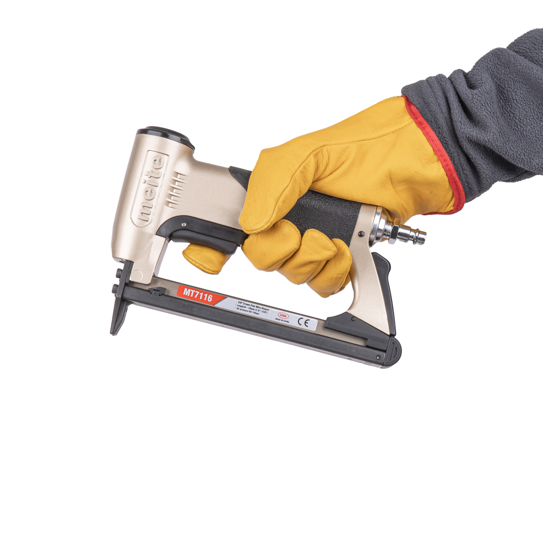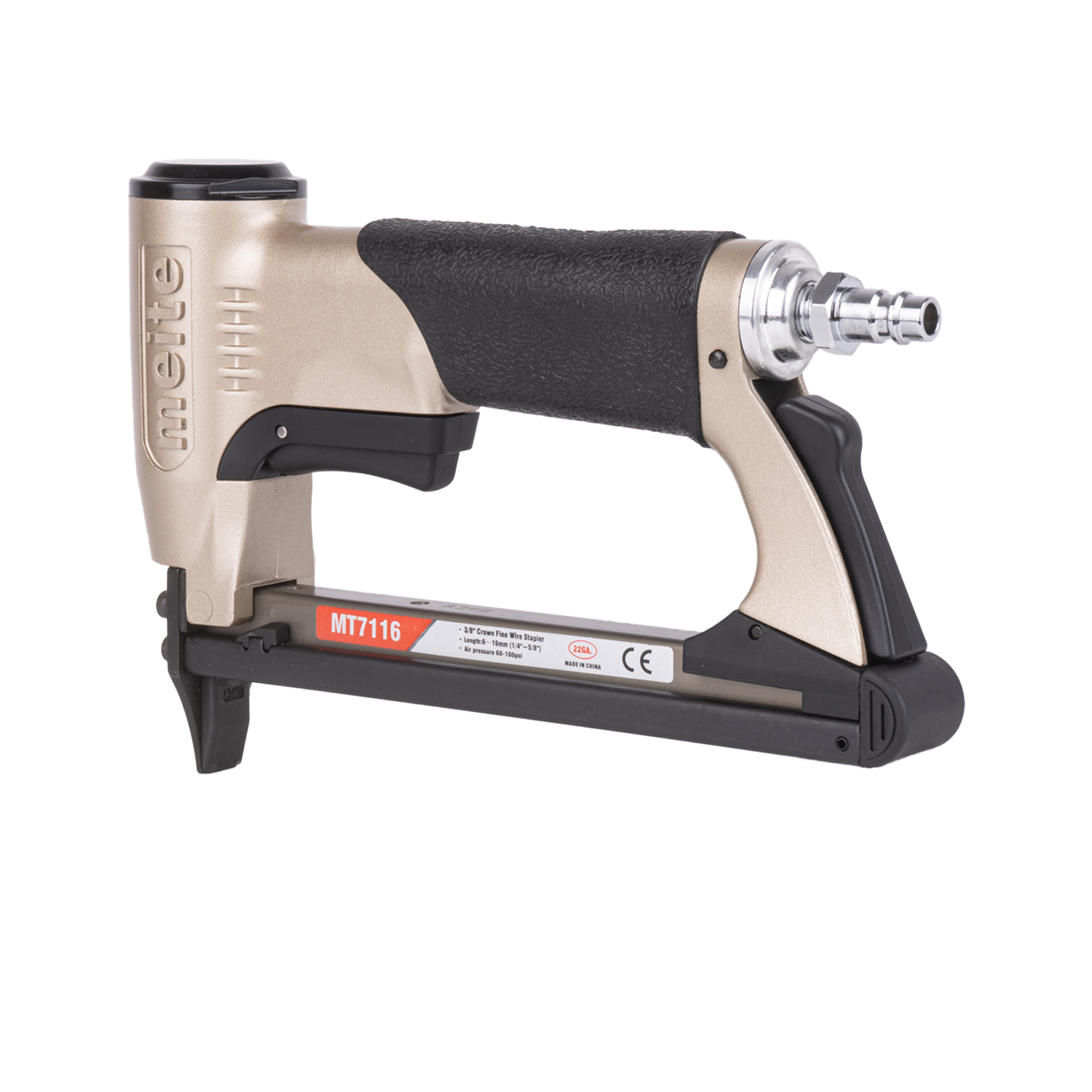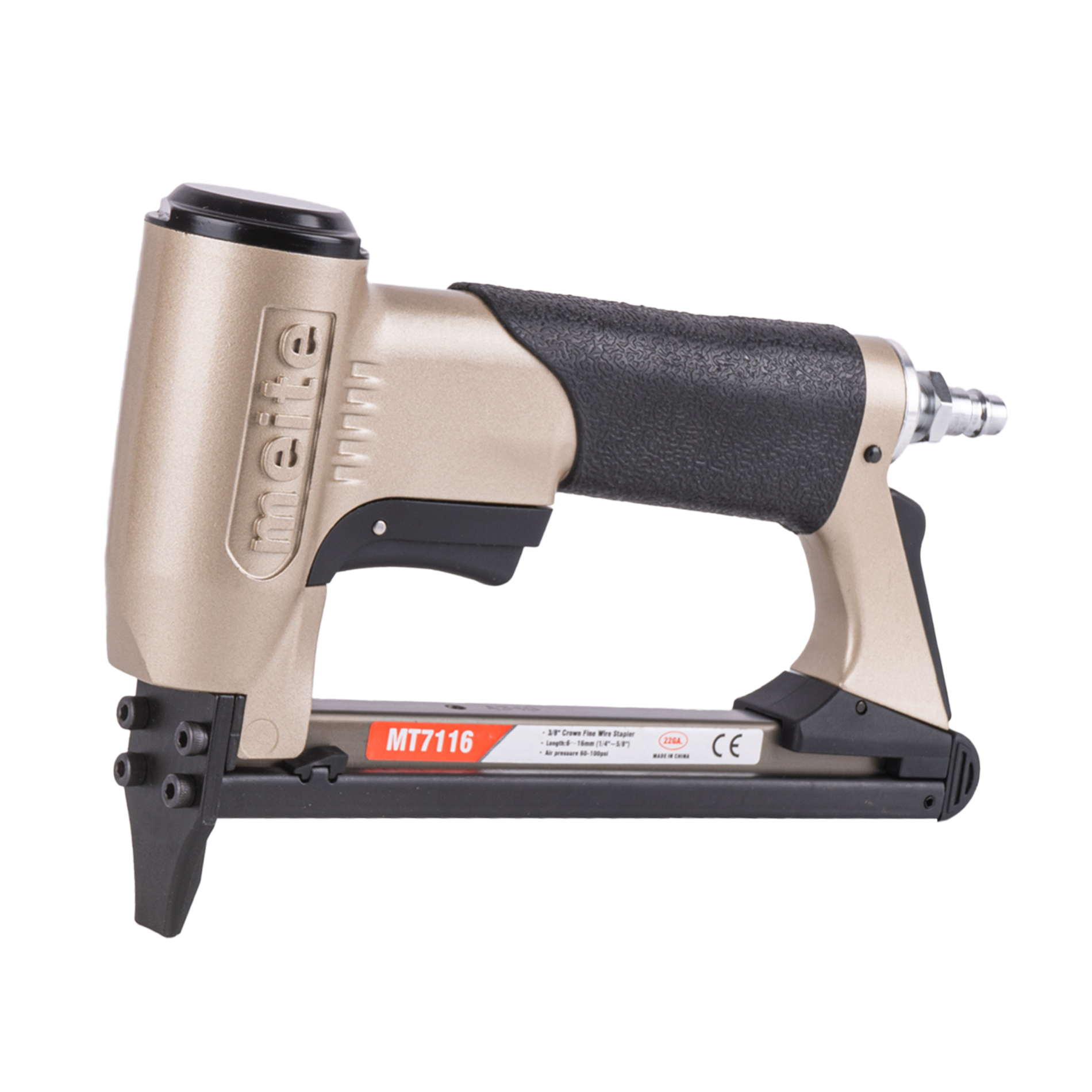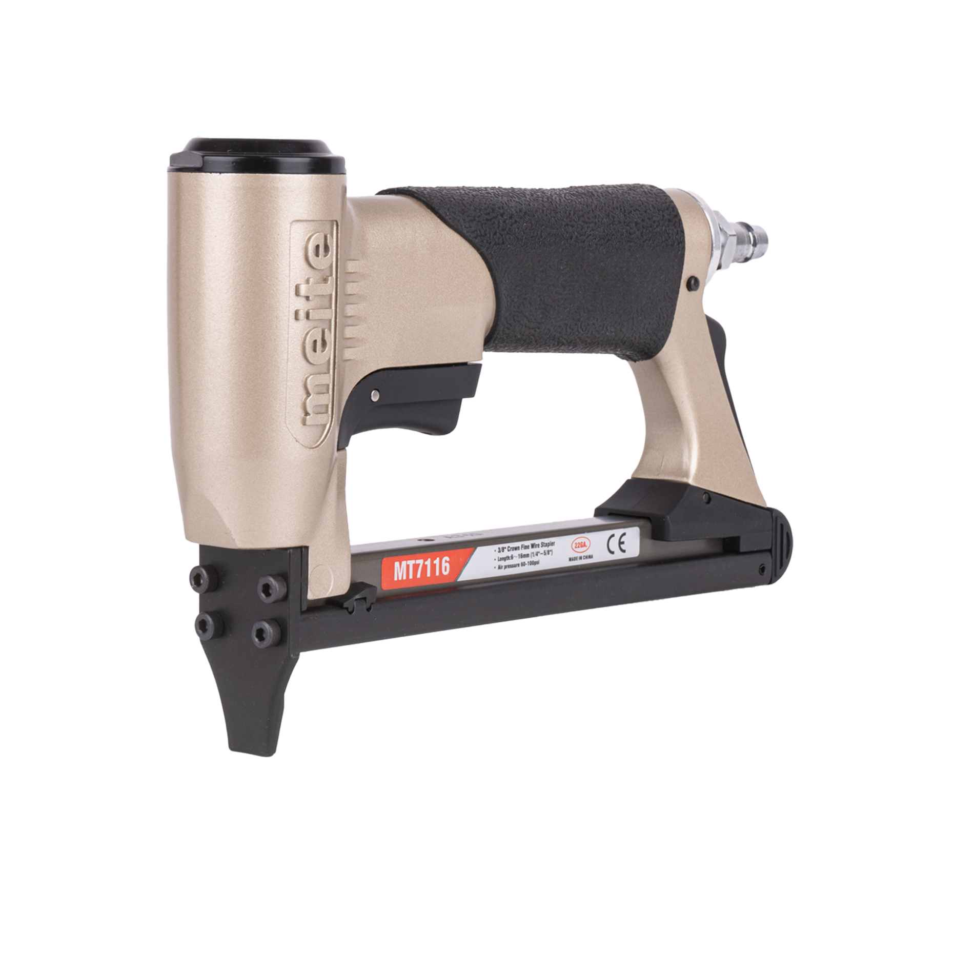 Обивочный пневматический степлер meite (майте) MT7116 GBA34G00301 - это профессиональный скобозабивной пневмопистолет для мебели. Идельно подойдет для обивки тканью на производство мягкой мебели. Использует скобу наименьшей толщины и применим для скорняжных работ. Используются мебельные обивочные скобы 22GA, тип 71 (V), Omer 3G, длина скобы 6-16 мм, ширина спинки скобы 9.1 мм, сечение проволоки 0.75x0.58 мм. За счет использования скоб более тонкого сечения Вместимость обоймы достигает 190 скоб, что позволяет реже менять обойму и экономить на крепеже. Небольшой вес, размеры и удобная эргономическая прорезиненная рукоятка делают эксплуатацию инструмента максимально комфортной и безопасной. Инструмент простой, надежный и крайне производительный, не требует специальных знаний и навыков. Наилучшее соотношение цены и высокого качества исполнения.